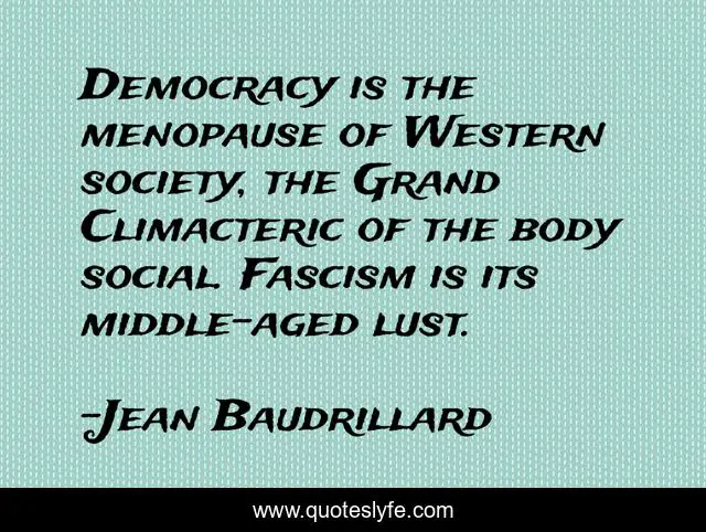 This page presents the quote "Democracy is the menopause of Western society, the Grand Climacteric of the body social. Fascism is its middle-aged lust.". Author of this quote is Jean Baudrillard. This quote is about politics, society,.