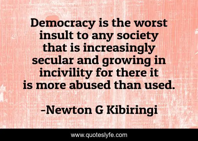 This page presents the quote "Democracy is the worst insult to any society that is increasingly secular and growing in incivility for there it is more abused than used.". Author of this quote is Newton G Kibiringi. This quote is about civility, democracy,.