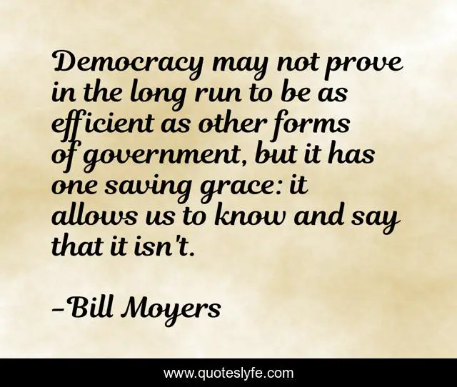 This page presents the quote "Democracy may not prove in the long run to be as efficient as other forms of government, but it has one saving grace: it allows us to know and say that it isn't.". Author of this quote is Bill Moyers. This quote is about grace, long, democracy,.
