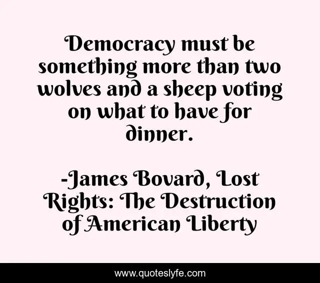 This page presents the quote "Democracy must be something more than two wolves and a sheep voting on what to have for dinner.". Author of this quote is James Bovard, Lost Rights: The Destruction of American Liberty. This quote is about freedom, government, paraphrase-gary-strand, democracy, misattributed-ben-franklin,.