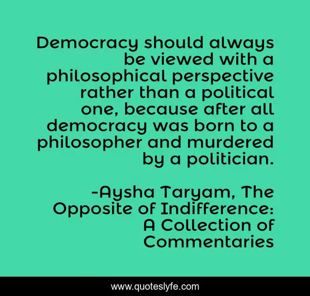 This page presents the quote "Democracy should always be viewed with a philosophical perspective rather than a political one, because after all democracy was born to a philosopher and murdered by a politician.". Author of this quote is Aysha Taryam, The Opposite of Indifference: A Collection of Commentaries. This quote is about politics, philosophy, democracy,.