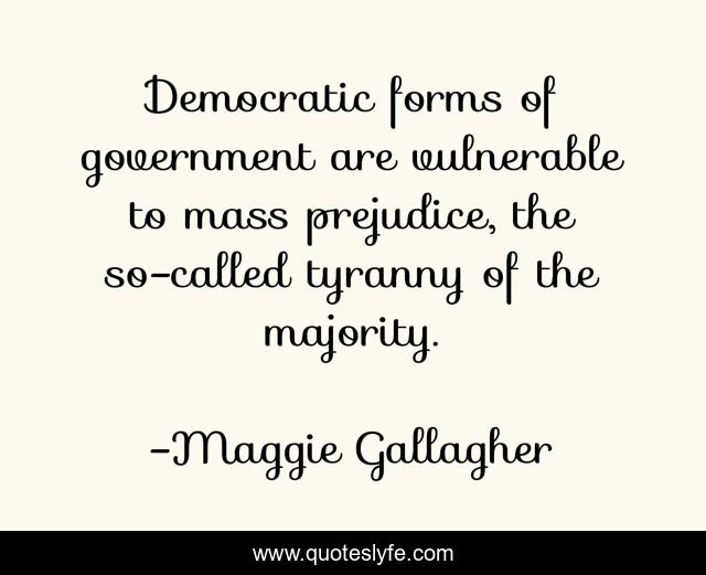 This page presents the quote "Democratic forms of government are vulnerable to mass prejudice, the so-called tyranny of the majority.". Author of this quote is Maggie Gallagher. This quote is about tyranny, prejudice,.
