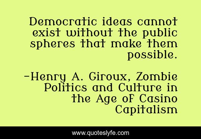 "Henry A. Giroux, Zombie Politics and Culture in the Age of Casino Capitalism Quotes." Quoteslyfe.com, 2025. Sat. 06 Dec. 2025. <https://www.quoteslyfe.com/quote/Democratic-ideas-cannot-exist-without-the-public-200220>.
