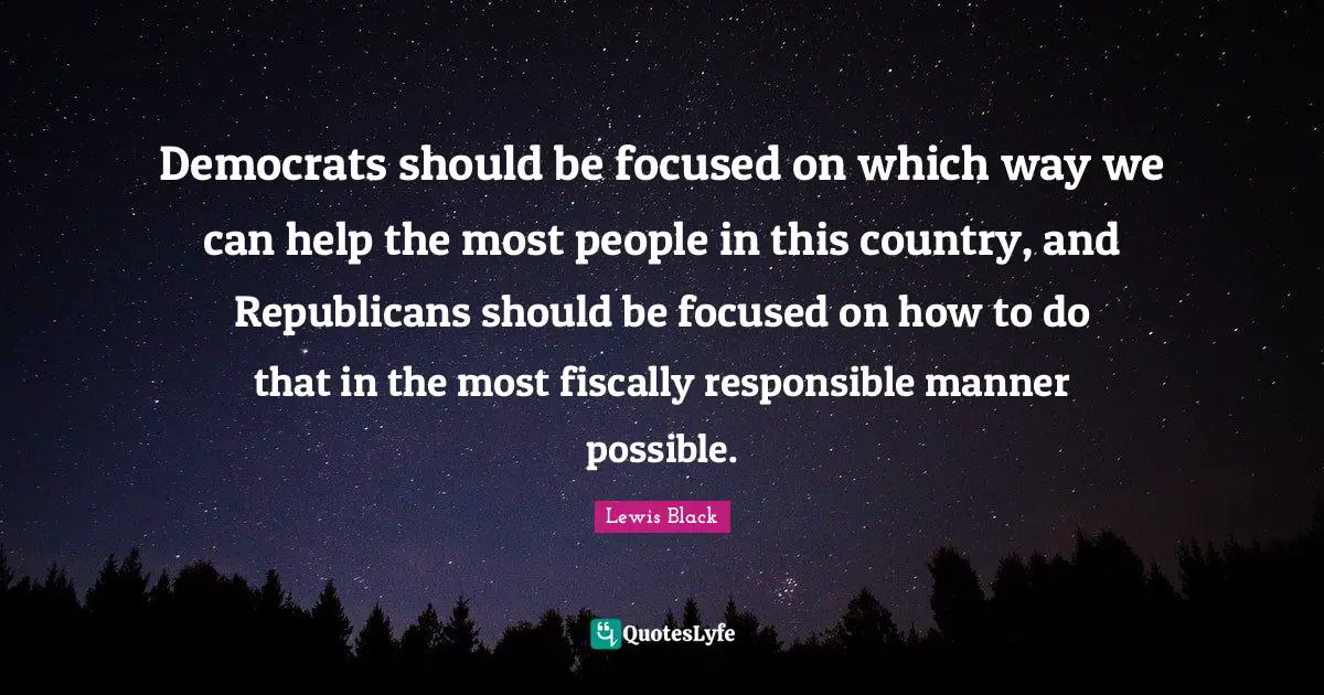 This page presents the quote "Democrats should be focused on which way we can help the most people in this country, and Republicans should be focused on how to do that in the most fiscally responsible manner possible.". Author of this quote is Lewis Black. This quote is about focused, way, country, people, responsible,.