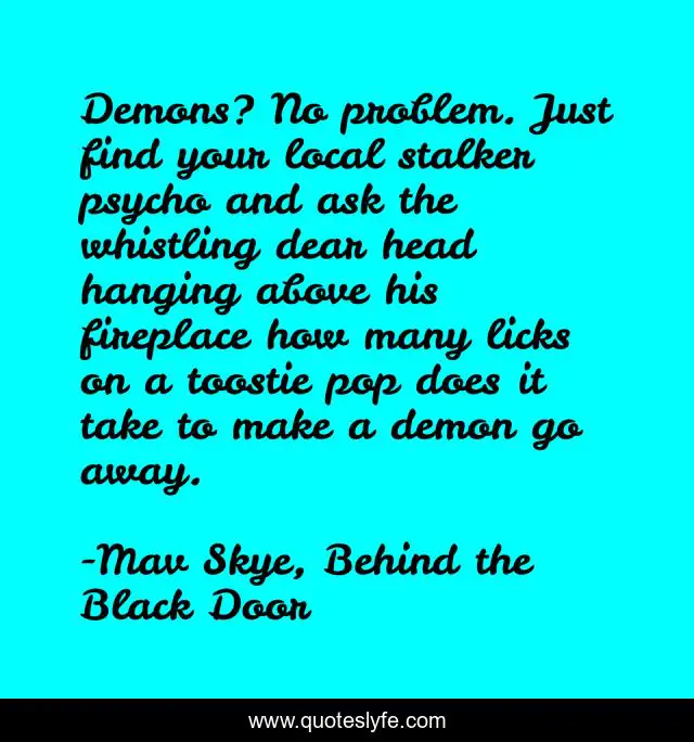 This page presents the quote "Demons? No problem. Just find your local stalker psycho and ask the whistling dear head hanging above his fireplace how many licks on a toostie pop does it take to make a demon go away.". Author of this quote is Mav Skye, Behind the Black Door. This quote is about horror, demons,.