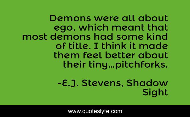 This page presents the quote "Demons were all about ego, which meant that most demons had some kind of title. I think it made them feel better about their tiny…pitchforks.". Author of this quote is E.J. Stevens, Shadow Sight. This quote is about humor, paranormal, demons,.