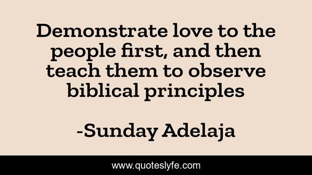This page presents the quote "Demonstrate love to the people first, and then teach them to observe biblical principles". Author of this quote is Sunday Adelaja. This quote is about life, blessing, love, jobless, people, money, work, job, purpose,.