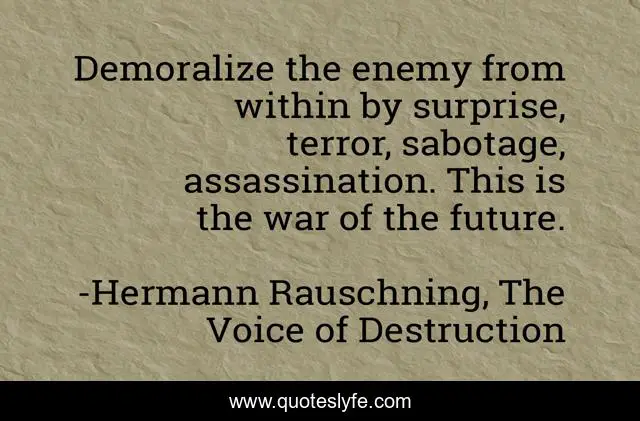 This page presents the quote "Demoralize the enemy from within by surprise, terror, sabotage, assassination. This is the war of the future.". Author of this quote is Hermann Rauschning, The Voice of Destruction. .
