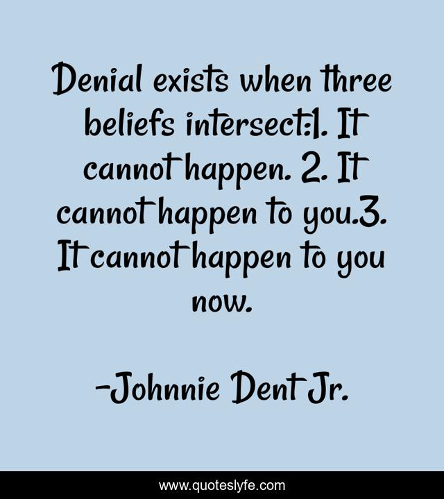 This page presents the quote "Denial exists when three beliefs intersect:1. It cannot happen. 2. It cannot happen to you.3. It cannot happen to you now.". Author of this quote is Johnnie Dent Jr.. This quote is about shock, denial, disbelief,.