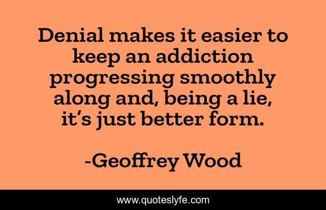 This page presents the quote "Denial makes it easier to keep an addiction progressing smoothly along and, being a lie, it’s just better form.". Author of this quote is Geoffrey Wood. This quote is about denial, christian-fiction, religion, grimrack, addiction, christianity,.