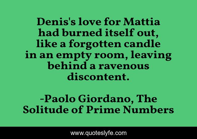 This page presents the quote "Denis's love for Mattia had burned itself out, like a forgotten candle in an empty room, leaving behind a ravenous discontent.". Author of this quote is Paolo Giordano, The Solitude of Prime Numbers. This quote is about love, break-ups, breakup, breaking-up, breakups, affection, break-up,.