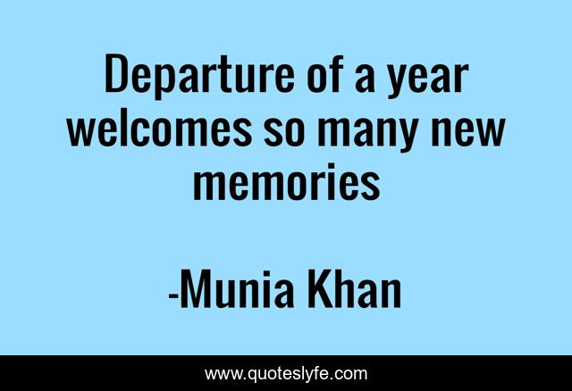 This page presents the quote "Departure of a year welcomes so many new memories". Author of this quote is Munia Khan. This quote is about new-year, memory, new-years, many, welcome, departure, new-years-eve, memories, year,.