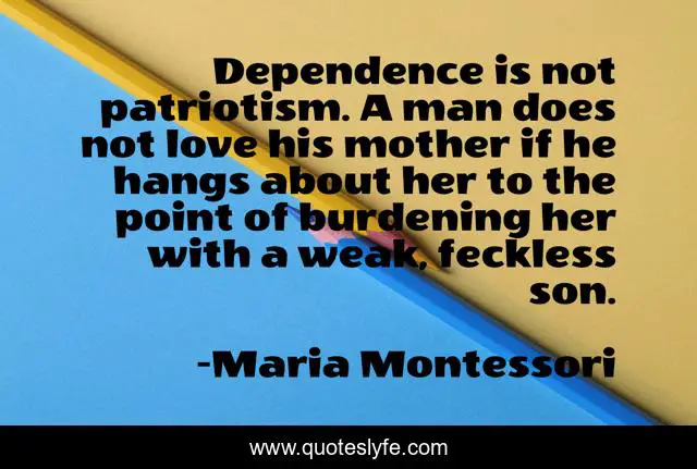 This page presents the quote "Dependence is not patriotism. A man does not love his mother if he hangs about her to the point of burdening her with a weak, feckless son.". Author of this quote is Maria Montessori. This quote is about son, love, affection, mother,.
