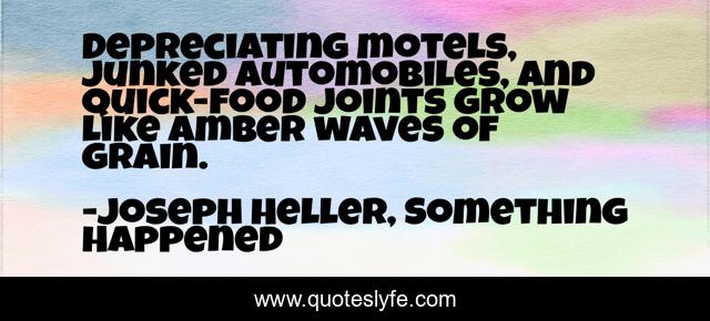 This page presents the quote "Depreciating motels, junked automobiles, and quick-food joints grow like amber waves of grain.". Author of this quote is Joseph Heller, Something Happened. .