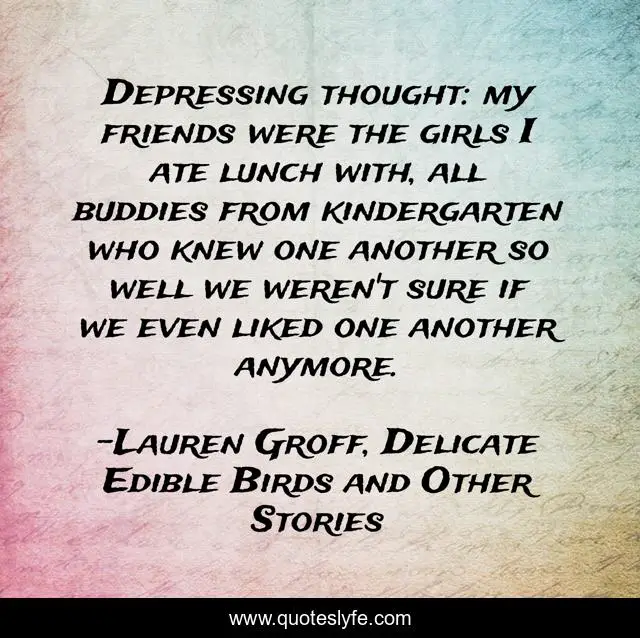 This page presents the quote "Depressing thought: my friends were the girls I ate lunch with, all buddies from kindergarten who knew one another so well we weren't sure if we even liked one another anymore.". Author of this quote is Lauren Groff, Delicate Edible Birds and Other Stories. .