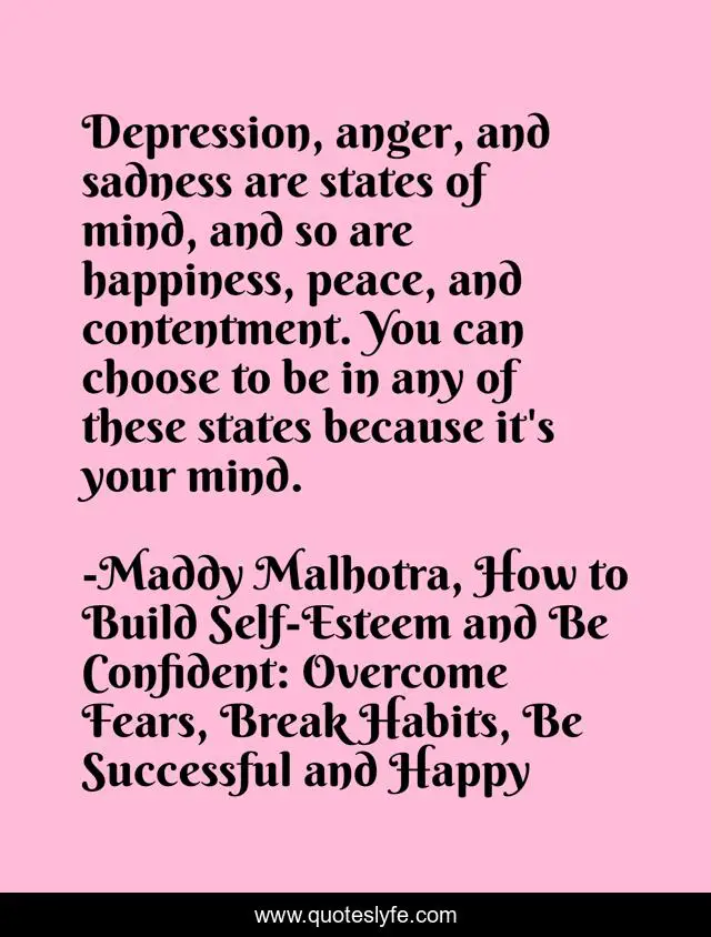 "Maddy Malhotra, How to Build Self-Esteem and Be Confident: Overcome Fears, Break Habits, Be Successful and Happy Quotes." Quoteslyfe.com, 2025. Fri. 05 Dec. 2025. <https://www.quoteslyfe.com/quote/Depression-anger-and-sadness-are-states-of-95357>.