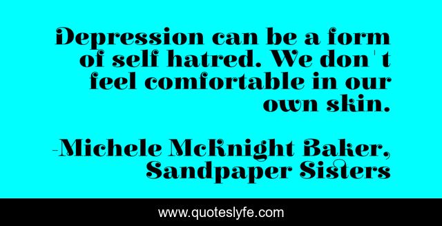 This page presents the quote "Depression can be a form of self hatred. We don't feel comfortable in our own skin.". Author of this quote is Michele McKnight Baker, Sandpaper Sisters. This quote is about self-hatred, depression, low-self-esteem,.