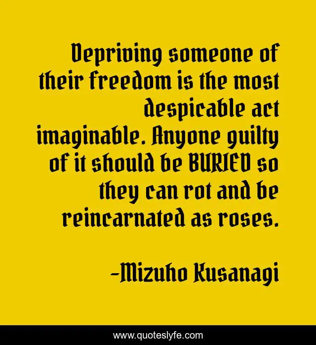 This page presents the quote "Depriving someone of their freedom is the most despicable act imaginable. Anyone guilty of it should be BURIED so they can rot and be reincarnated as roses.". Author of this quote is Mizuho Kusanagi. This quote is about freedom, dragons, green, red, thunder,.