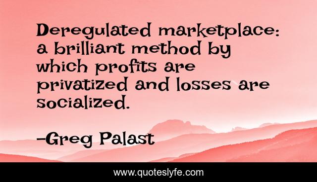 This page presents the quote "Deregulated marketplace: a brilliant method by which profits are privatized and losses are socialized.". Author of this quote is Greg Palast. This quote is about capitalism, neoliberalism,.