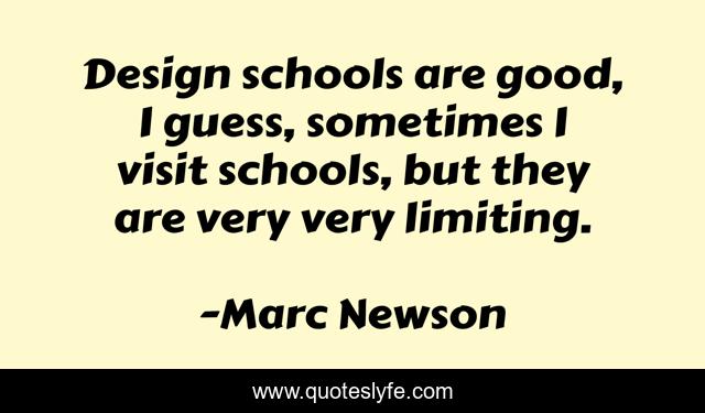 This page presents the quote "Design schools are good, I guess, sometimes I visit schools, but they are very very limiting.". Author of this quote is Marc Newson. This quote is about guess, good, sometimes,.