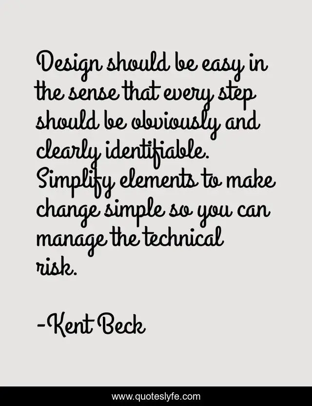 This page presents the quote "Design should be easy in the sense that every step should be obviously and clearly identifiable. Simplify elements to make change simple so you can manage the technical risk.". Author of this quote is Kent Beck. This quote is about simple, risk, change,.