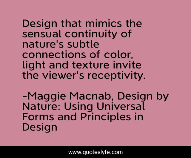 This page presents the quote "Design that mimics the sensual continuity of nature's subtle connections of color, light and texture invite the viewer's receptivity.". Author of this quote is Maggie Macnab, Design by Nature: Using Universal Forms and Principles in Design. This quote is about branding, design, sensuality, nature,.