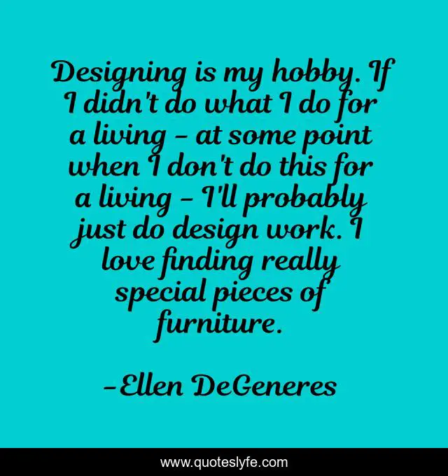 This page presents the quote "Designing is my hobby. If I didn't do what I do for a living - at some point when I don't do this for a living - I'll probably just do design work. I love finding really special pieces of furniture.". Author of this quote is Ellen DeGeneres. This quote is about living, work, love, affection,.