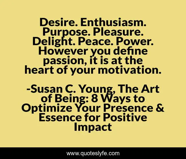 "Susan C. Young, The Art of Being: 8 Ways to Optimize Your Presence & Essence for Positive Impact Quotes." Quoteslyfe.com, 2025. Fri. 05 Dec. 2025. <https://www.quoteslyfe.com/quote/Desire-Enthusiasm-Purpose-Pleasure-Delight-Peace-Power-92371>.