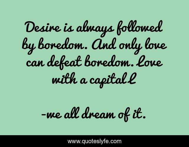 This page presents the quote "Desire is always followed by boredom. And only love can defeat boredom. Love with a capital L". Author of this quote is we all dream of it.. This quote is about grégoire delacourt, la liste de mes envies,.