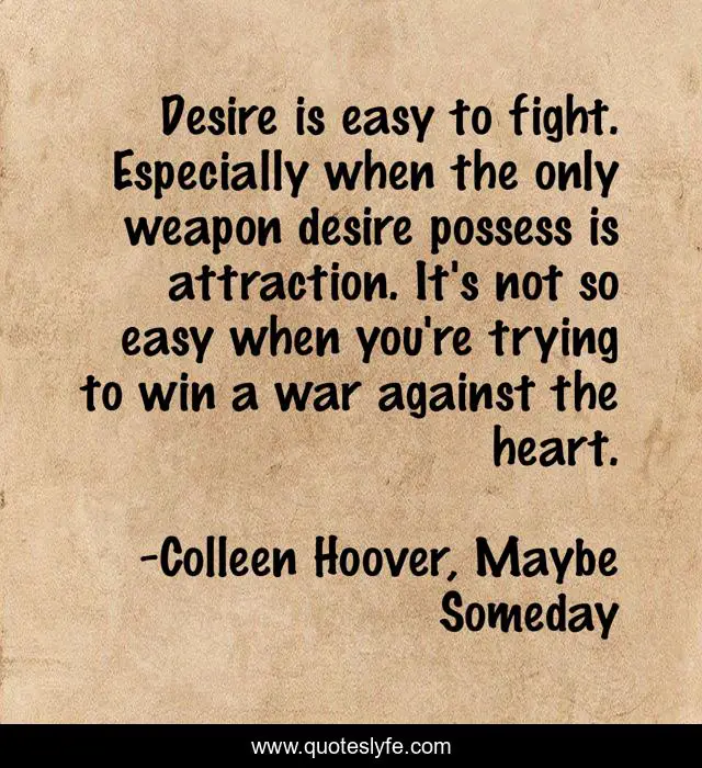 "Colleen Hoover, Maybe Someday Quotes." Quoteslyfe.com, 2025. Mon. 08 Dec. 2025. <https://www.quoteslyfe.com/quote/Desire-is-easy-to-fight-Especially-when-145598>.