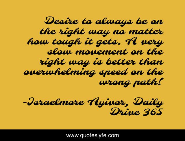 This page presents the quote "Desire to always be on the right way no matter how tough it gets. A very slow movement on the right way is better than overwhelming speed on the wrong path!". Author of this quote is Israelmore Ayivor, Daily Drive 365. This quote is about desire, food-for-thought, right, tough, israelmore-ayivor, overwhelm, move, slow-movement, right-way,.