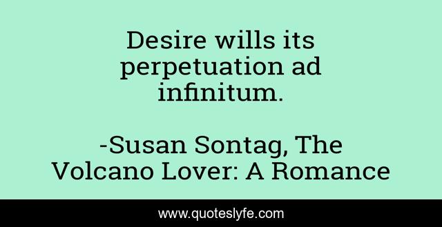 This page presents the quote "Desire wills its perpetuation ad infinitum.". Author of this quote is Susan Sontag, The Volcano Lover: A Romance. This quote is about desire, eternity, infinity, insatiability, perpetuation, longing,.