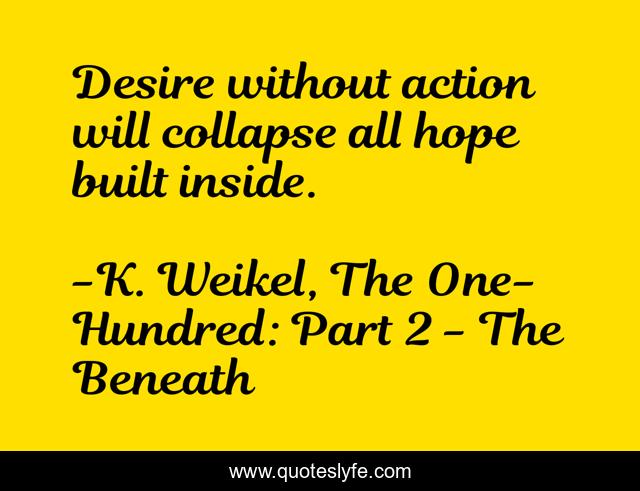 This page presents the quote "Desire without action will collapse all hope built inside.". Author of this quote is K. Weikel, The One-Hundred: Part 2 - The Beneath. This quote is about desire, weikel, hope,.