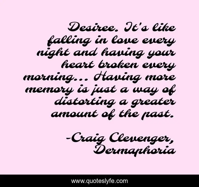 This page presents the quote "Desiree. It's like falling in love every night and having your heart broken every morning... Having more memory is just a way of distorting a greater amount of the past.". Author of this quote is Craig Clevenger, Dermaphoria. This quote is about distorted-memories, memories, lost-love,.
