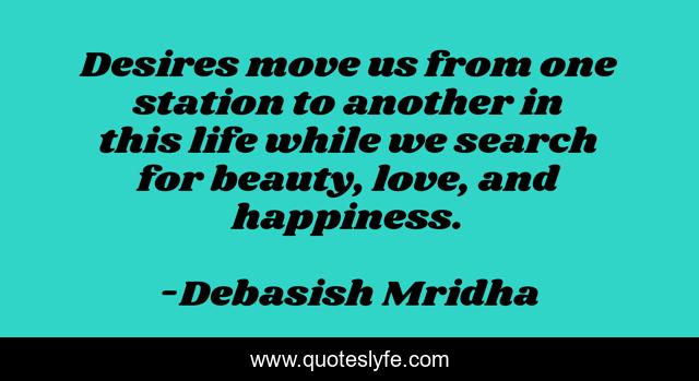 This page presents the quote "Desires move us from one station to another in this life while we search for beauty, love, and happiness.". Author of this quote is Debasish Mridha. This quote is about love, beauty, desires, philosophy, debasish-mridha, desires-keep-us-moving-in-life, quotes, debasish-mridha-md, inspirational,.
