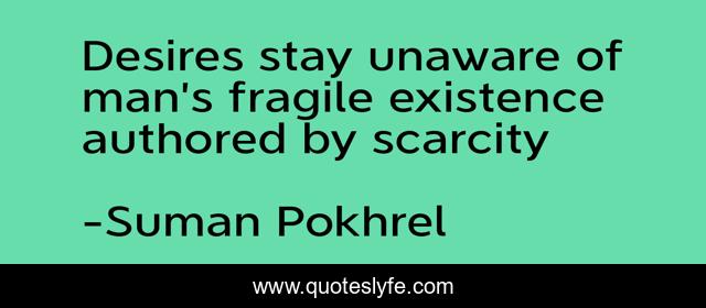 This page presents the quote "Desires stay unaware of man’s fragile existence authored by scarcity". Author of this quote is Suman Pokhrel. This quote is about desire, existence, limitations,.