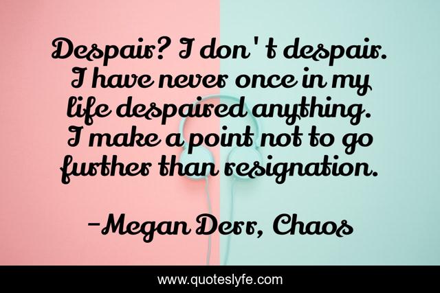 This page presents the quote "Despair? I don't despair. I have never once in my life despaired anything. I make a point not to go further than resignation.". Author of this quote is Megan Derr, Chaos. This quote is about despair, resignation,.