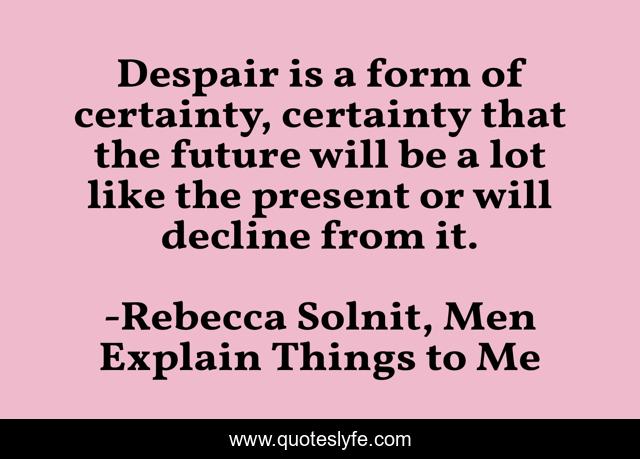 This page presents the quote "Despair is a form of certainty, certainty that the future will be a lot like the present or will decline from it.". Author of this quote is Rebecca Solnit, Men Explain Things to Me. .