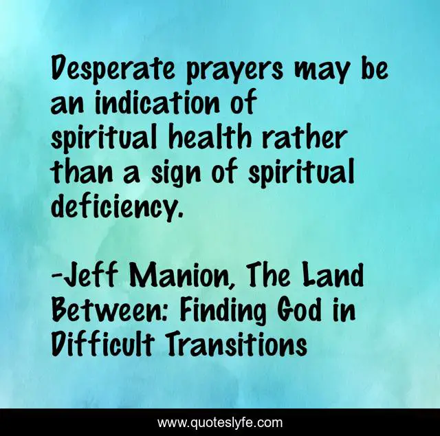 This page presents the quote "Desperate prayers may be an indication of spiritual health rather than a sign of spiritual deficiency.". Author of this quote is Jeff Manion, The Land Between: Finding God in Difficult Transitions. This quote is about enthusiasm, waiting, transitions, inspirational,.