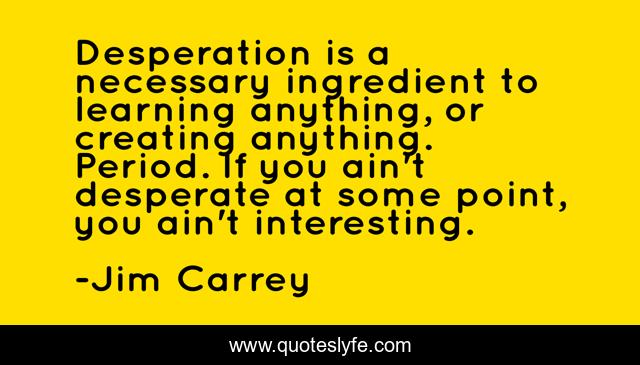 This page presents the quote "Desperation is a necessary ingredient to learning anything, or creating anything. Period. If you ain't desperate at some point, you ain't interesting.". Author of this quote is Jim Carrey. This quote is about interesting, creating,.