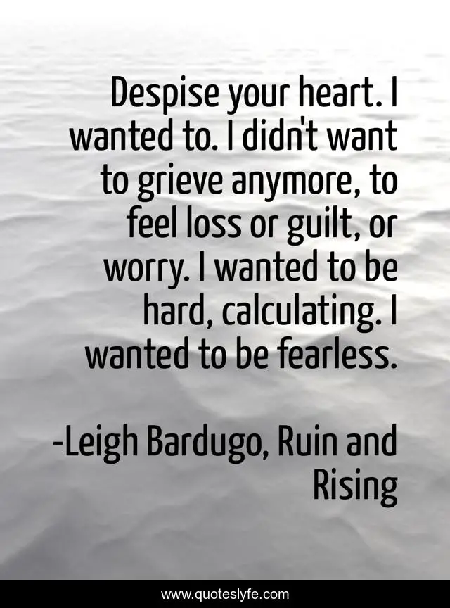 This page presents the quote "Despise your heart. I wanted to. I didn't want to grieve anymore, to feel loss or guilt, or worry. I wanted to be hard, calculating. I wanted to be fearless.". Author of this quote is Leigh Bardugo, Ruin and Rising. .