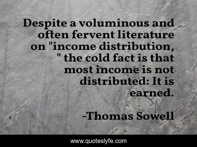 This page presents the quote "Despite a voluminous and often fervent literature on "income distribution, " the cold fact is that most income is not distributed: It is earned.". Author of this quote is Thomas Sowell. This quote is about wealth, economics, socialism, earnings, income, distribution,.