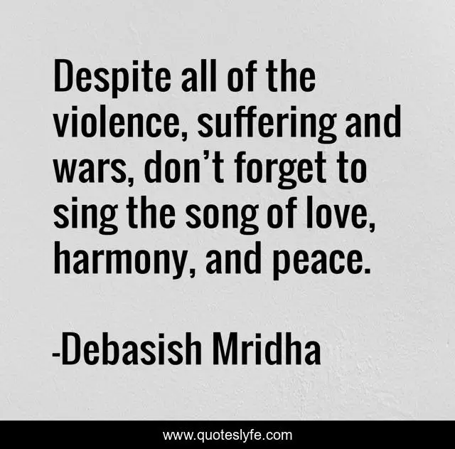 This page presents the quote "Despite all of the violence, suffering and wars, don’t forget to sing the song of love, harmony, and peace.". Author of this quote is Debasish Mridha. This quote is about peace, love, violence, philosophy, debasish-mridha, wars, suffering, harmony, inspirational,.