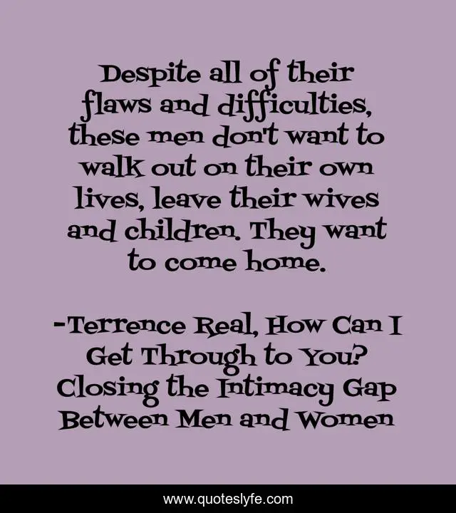 This page presents the quote "Despite all of their flaws and difficulties, these men don't want to walk out on their own lives, leave their wives and children. They want to come home.". Author of this quote is Terrence Real, How Can I Get Through to You? Closing the Intimacy Gap Between Men and Women. .