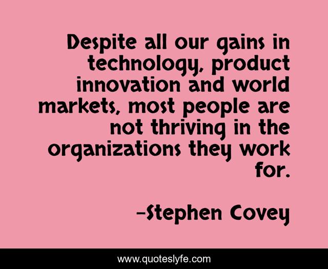 This page presents the quote "Despite all our gains in technology, product innovation and world markets, most people are not thriving in the organizations they work for.". Author of this quote is Stephen Covey. This quote is about world, work, innovation,.