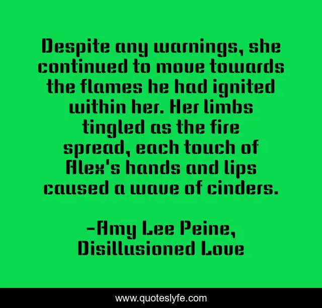 This page presents the quote "Despite any warnings, she continued to move towards the flames he had ignited within her. Her limbs tingled as the fire spread, each touch of Alex's hands and lips caused a wave of cinders.". Author of this quote is Amy Lee Peine, Disillusioned Love. This quote is about romance-book, love, kiss, riana, contemporary, love-story, romance-novels, alex, affection,.