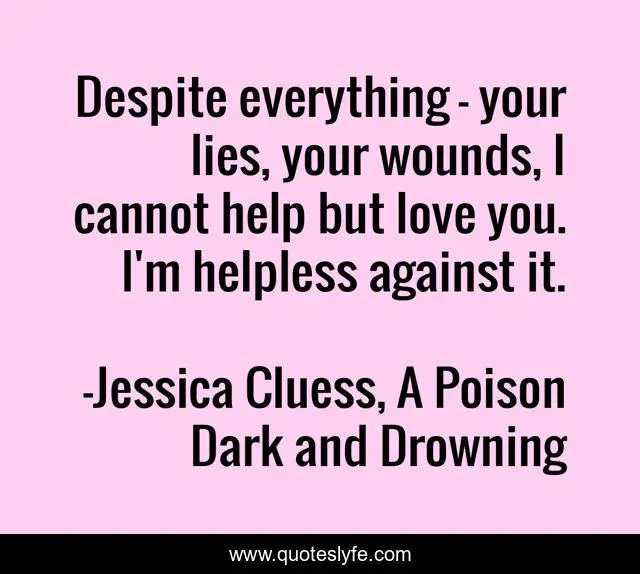 This page presents the quote "Despite everything - your lies, your wounds, I cannot help but love you. I'm helpless against it.". Author of this quote is Jessica Cluess, A Poison Dark and Drowning. This quote is about a-poison-dark-and-drowning, romantic, howel, love, affection, blackwood,.