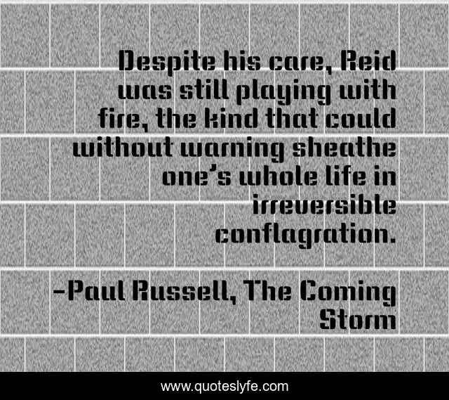 This page presents the quote "Despite his care, Reid was still playing with fire, the kind that could without warning sheathe one’s whole life in irreversible conflagration.". Author of this quote is Paul Russell, The Coming Storm. This quote is about fire, conflagration,.