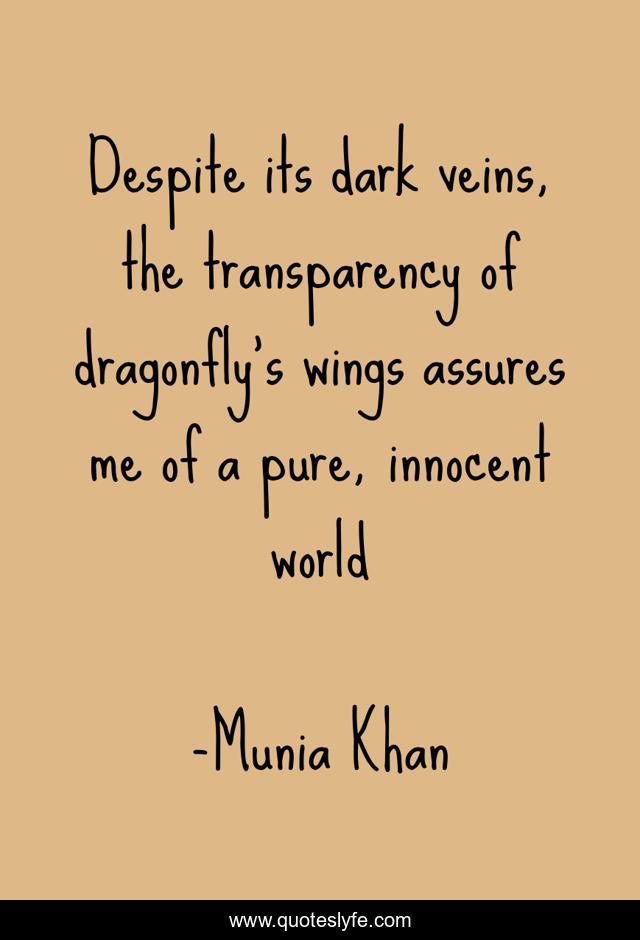 This page presents the quote "Despite its dark veins, the transparency of dragonfly’s wings assures me of a pure, innocent world". Author of this quote is Munia Khan. This quote is about heart, insects, pure-hearted, philosophical, human, pure-thoughts, pure-heart, pure, enthusiasm,.