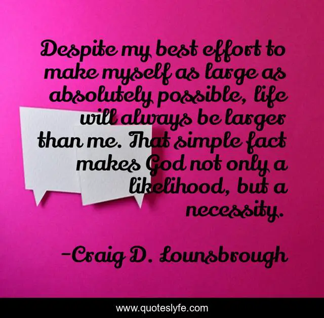 This page presents the quote "Despite my best effort to make myself as large as absolutely possible, life will always be larger than me. That simple fact makes God not only a likelihood, but a necessity.". Author of this quote is Craig D. Lounsbrough. This quote is about bible, christian, big, evidence, large, necessity, god, christianity, likelihood,.